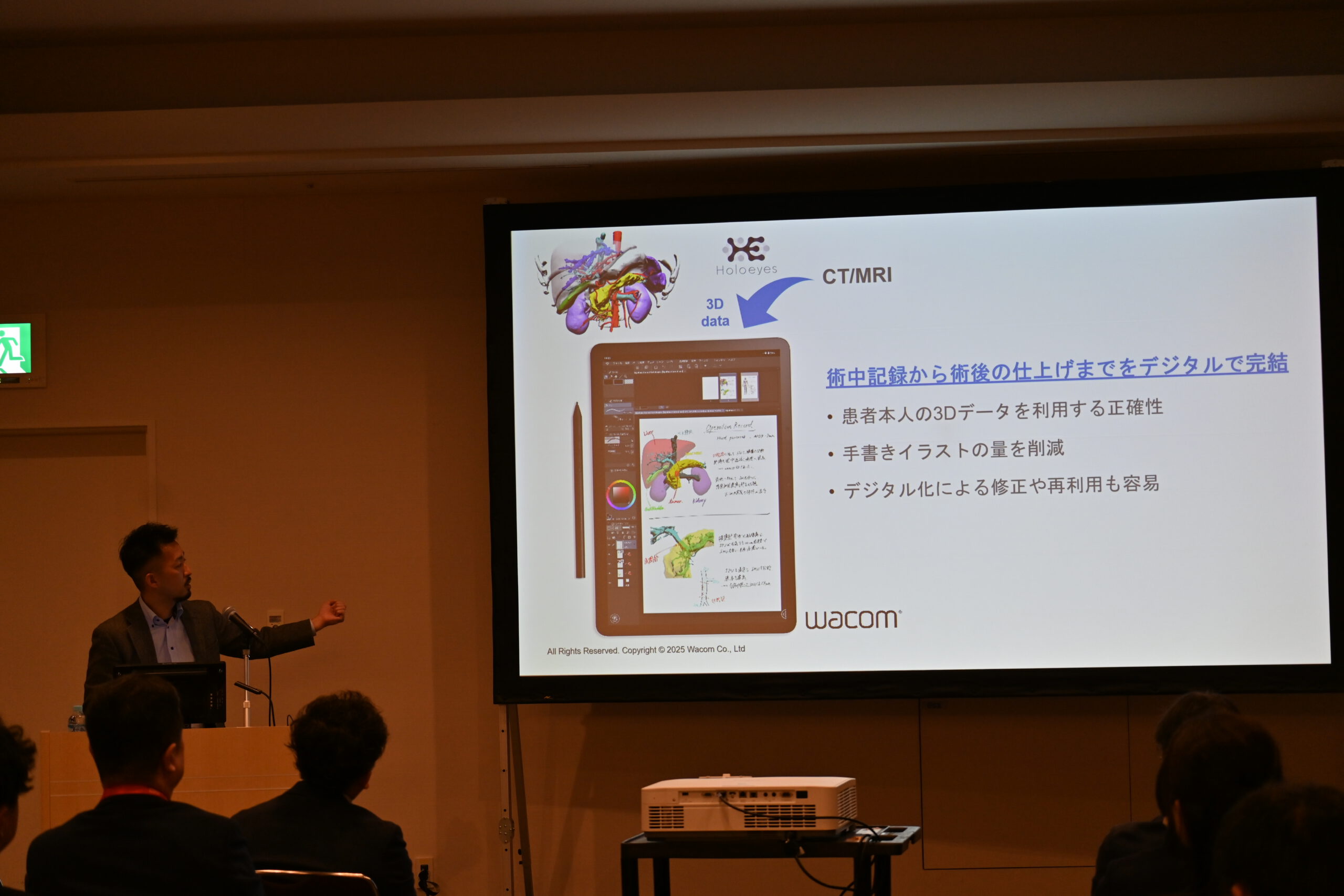 前半ではVR(Holoeyes)による手術支援の臨床応用、後半ではWacomによるデジタルインク技術を用いた手術記録DXの可能性が提示され、最後に実機体験会が行われました。