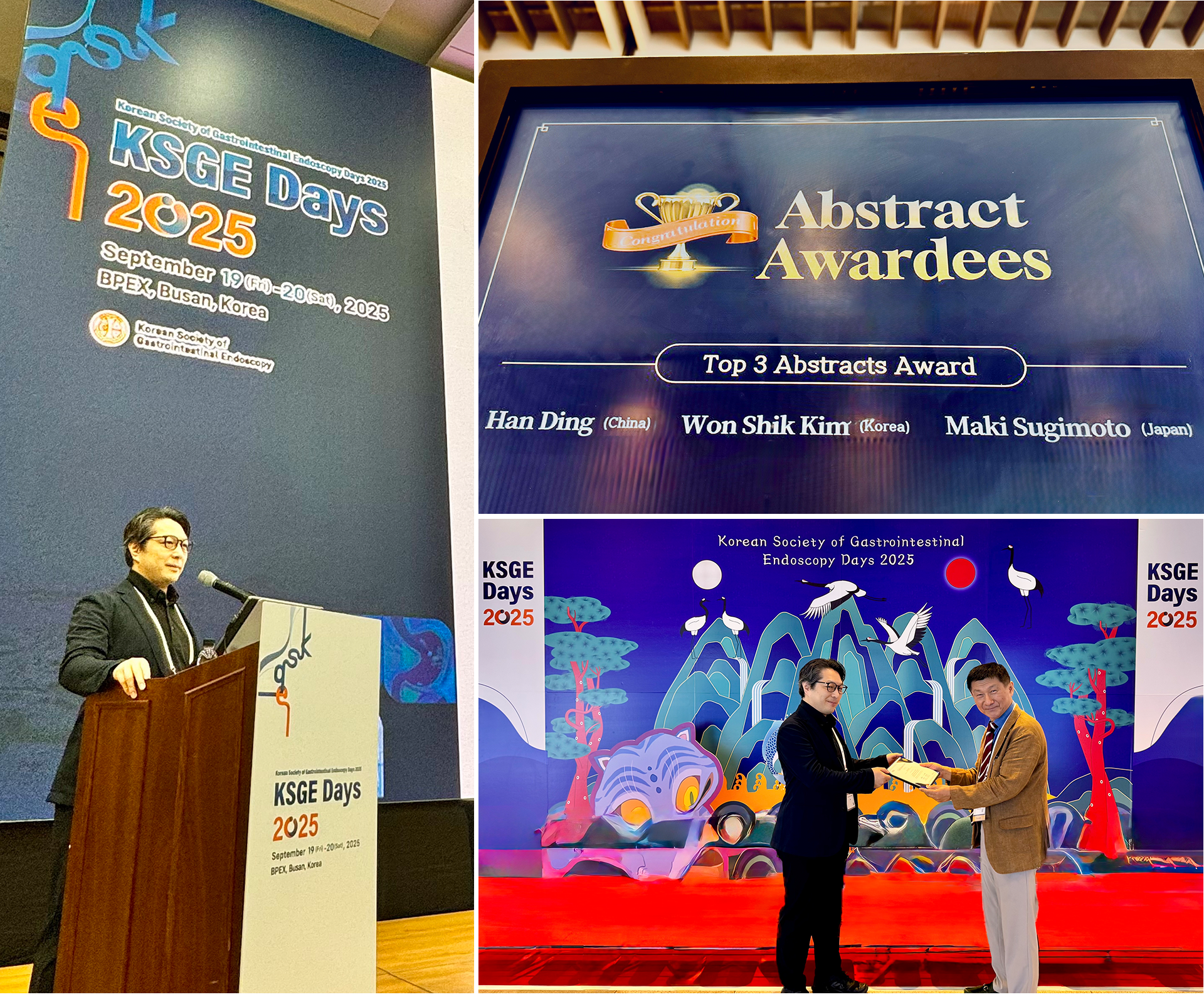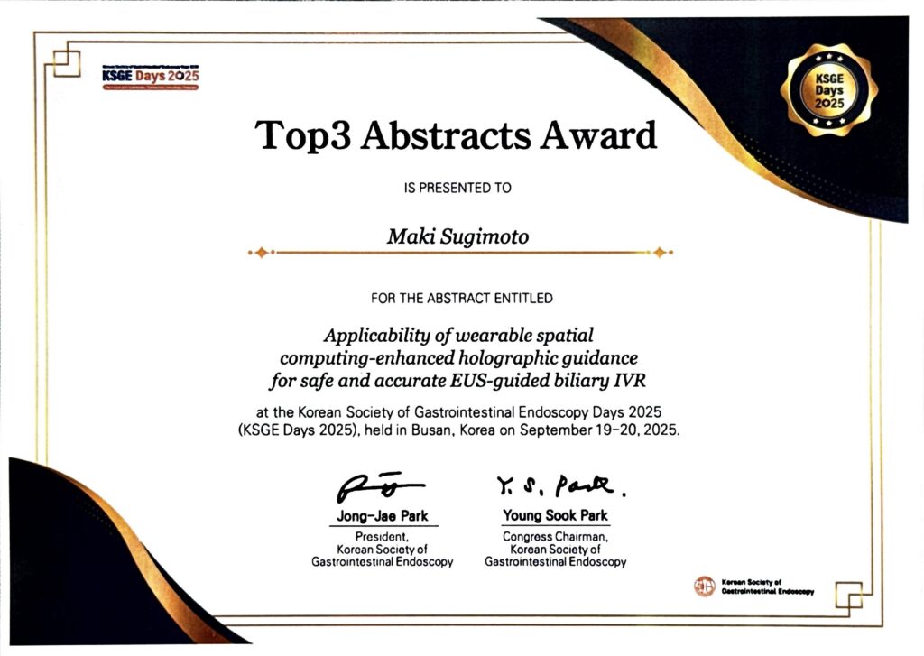 2025年9月19日(金)〜20日(土)に韓国・釜山で開催されたKorean Society of Gastrointestinal Endoscopy Days 2025(KSGE Days 2025|韓国消化器内視鏡学会)にて、弊社代表取締役CEO 杉本真樹が学会賞「Top 3 Abstracts Award」を受賞しました。
