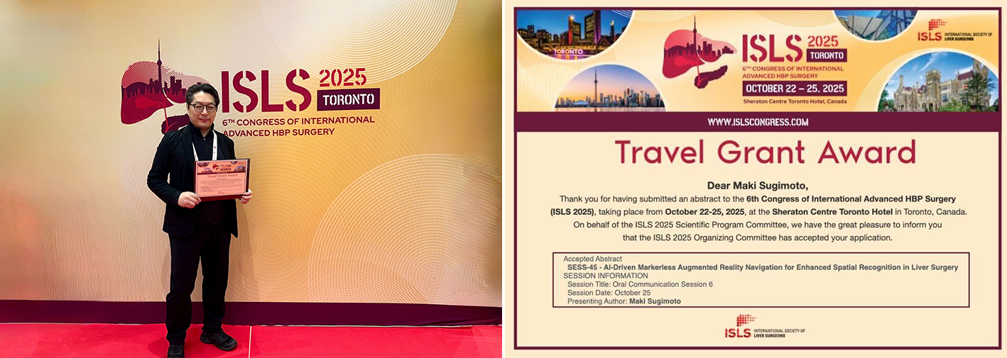 このたび、カナダ・トロントで2025年10月22日〜25日に開催された The 6th Congress of International Advanced HBP Surgery:ISLS 2025(第6回国際先進肝胆膵外科学会)において、10月25日に口演発表を行い、学会賞であるTravel Grant Awardを受賞しました。