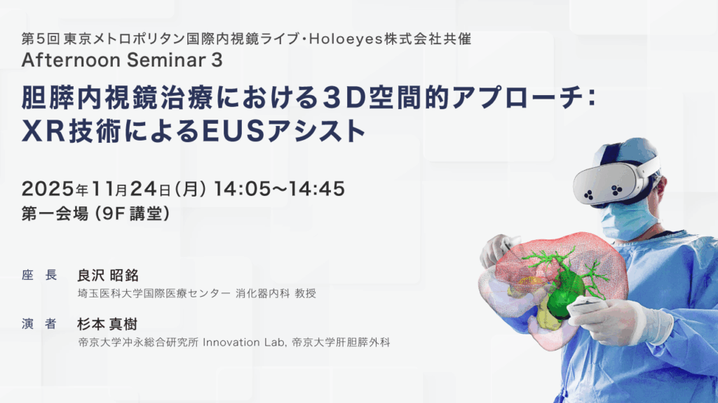 2025年11月24日(月・祝)に、第5回東京メトロポリタン国際内視鏡ライブと共催でAfternoon Seminar 3「胆膵内視鏡治療における3D空間的アプローチ:XR技術によるEUSアシスト」を開催します。